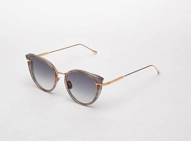Oprawa w stylu kociego oka w stylu retro, ożywiona nowym geometrycznym mostkiem i wyposażona w tradycyjne końcówki. Ramka ze stopu Infinite Black z octanu i 22-karatowego żółtego złota (warstwa ok. 5µ i stempel jubilerski wewnątrz zauszników). Szare soczewki gradientowe CR39 z obróbką AR.
