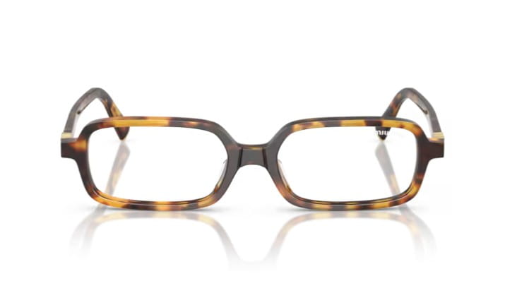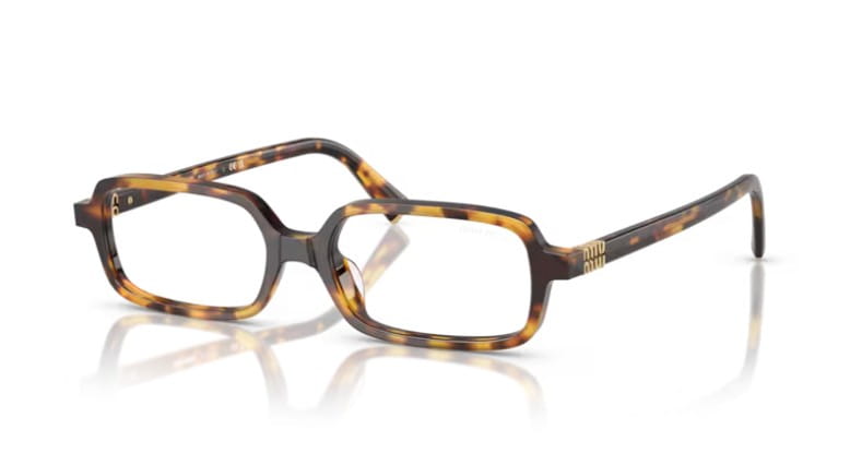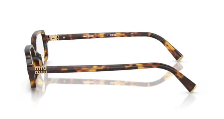 Miu Miu na nowo odkrywa poprzedni popularny model z wąskimi prostokątnymi soczewkami i eleganckimi liniami. Na metalowych zausznikach wyróżnia się delikatne logo Miu Miu, które jednocześnie pełni rolę eleganckiego detalu.